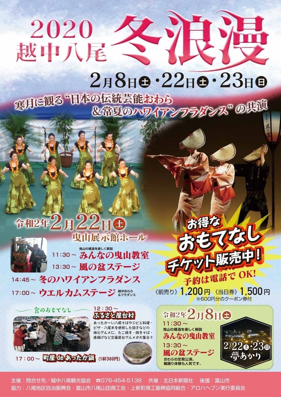 料 金:冬浪漫おもてなしチケット1,500円(ウェルカムステージ鑑賞券とふるさ屋台村食事券600円分がセット)、みんなの曳山教室500円(高校生以下300円、小学生以下無料)、風の盆ステージ観賞のみ1,500円、風の盆ステージ観賞とガイドツアー3,000円
