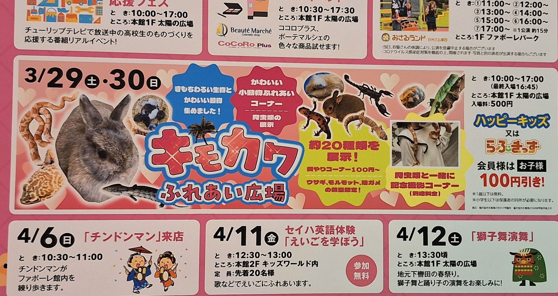 入場料:500円 ハッピーキッズ又はラブキッズ会員は子供100円引き ※1歳以下無料、小学生以下は保護者同伴必要