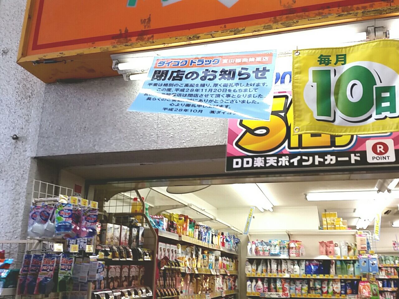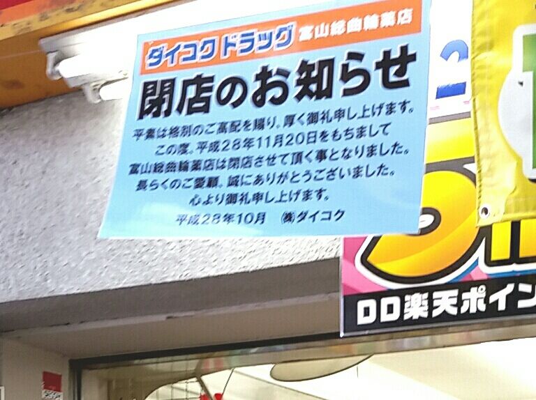 2016年11月11日 総曲輪にあるドラッグストア『ダイコクドラック総曲輪店(そうがわてん)』が閉店するらしい。 カテゴリ:閉店 たくさんの商店が立ち並ぶ『総曲輪通り』 そんな『総曲輪通り』で 元気いっぱいのドラッグストア 『ダイコクドラッグ』! が、閉店するなんて情報が。。 場所は、 市電通りから『総曲輪通り』入ってすぐ。 『総曲輪通り』入ってすぐある オレンジ色の看板『ダイコクドラック』 今日もいつもどおり元気いっぱいな店員さん。 だけど。。。 本当に閉店するみたい。 11月20日で閉店。 エキサイティングディスカウント 閉店しちゃいます。涙。 【店舗情報】 店 名:ダイコクドラッグ 総曲輪店(そうがわてん) 住 所:富山市総曲輪3-5-8 第一KKビル1,2階 電 話:076-423-6556 営業時間 10:00~20:00 定休日:なし 「開店・閉店」カテゴリの最新記事 とやま速報 Follow @toyamadays 石金にあるスーパー銭湯『満天の湯』のお風呂を堪能。お風呂の後は美味しいごはん『なめこおろしそば』と『豚しょうが焼き』食べてみた。富山初上陸!婦中町にピザ専門店『テキサスハンズ富山婦中店』がオープンするらしい。元『てば壱婦中店』があったところ。